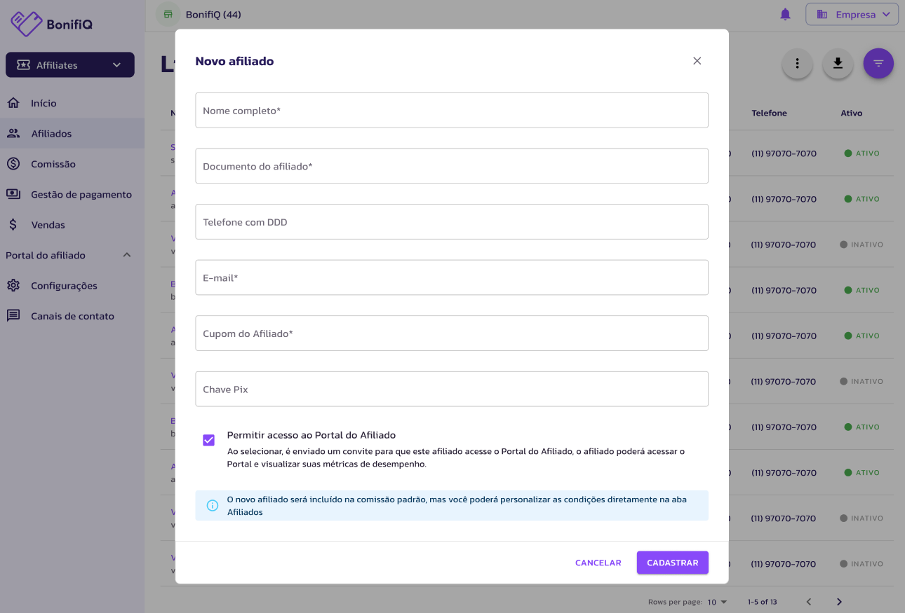 É preciso já ter criado previamente o cupom do afiliado na sua plataforma de e-commerce, ao criar um afiliado ele será criado na regra padrão de comissão, você pode alterar ela depois diretamente no afiliado.