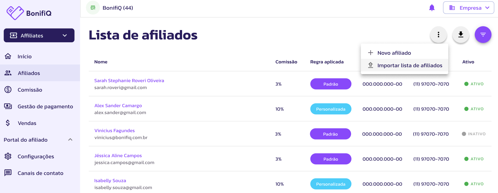 É possível cadastrar individualmente cada afiliado, ou importando uma lista com vários afiliados.
