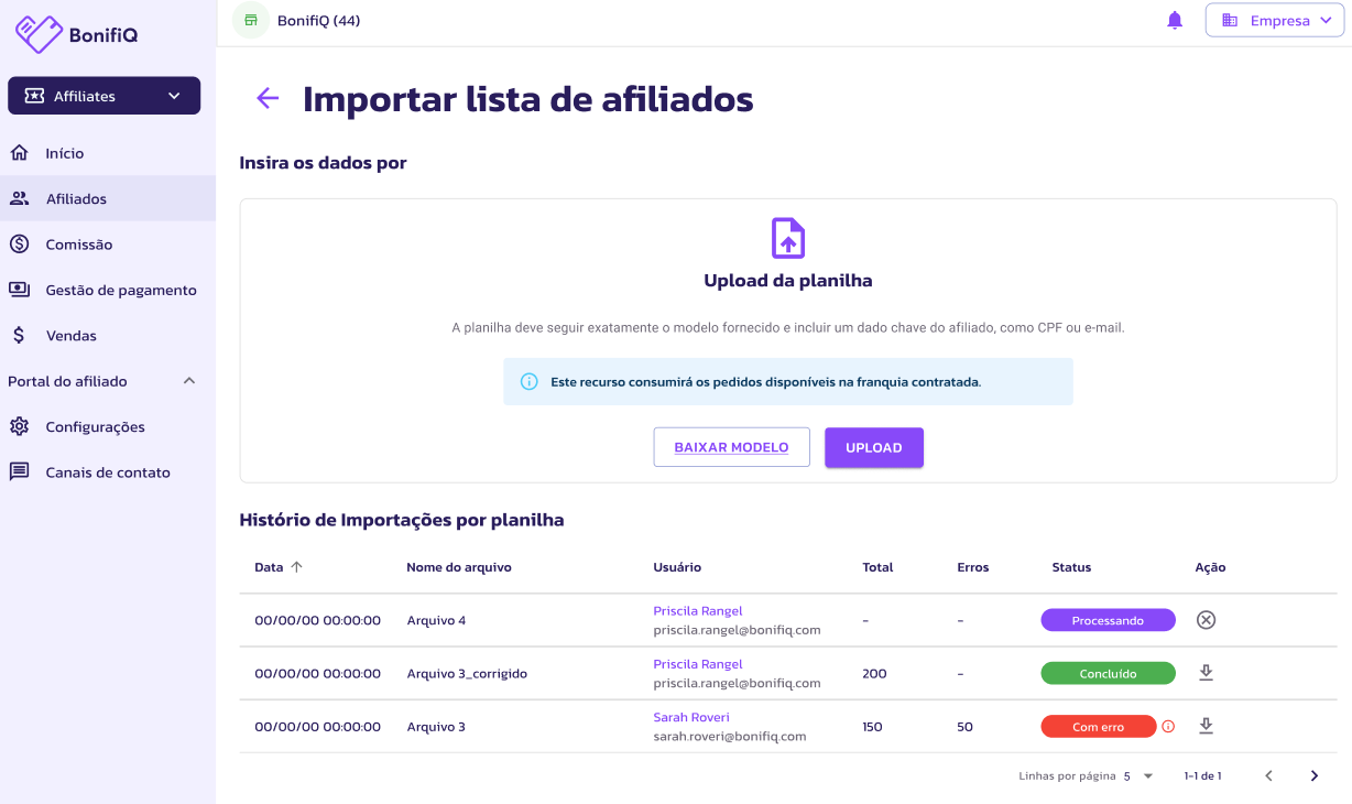 É só baixar o modelo da planilha e preencher com as informações dos afiliados e importar. Após importado irá aparecer em afiliados.