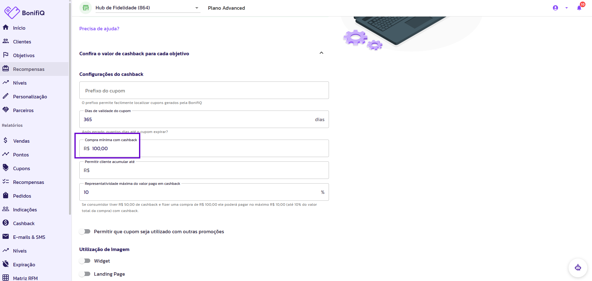 É possível configurar a compra mínima com cashback, sendo assim o valor mínimo que o consumidor terá que ter no carrinho para aparecer a opção de utilizar cashback.