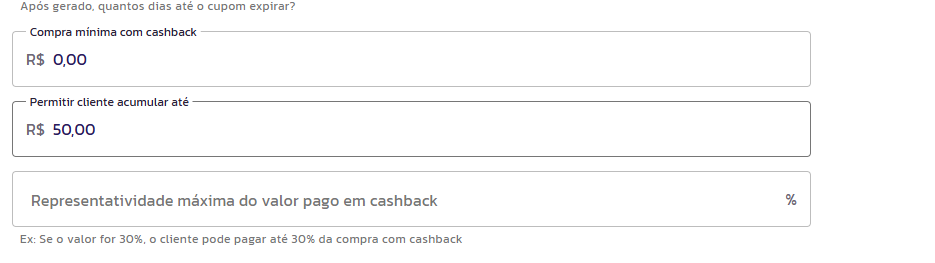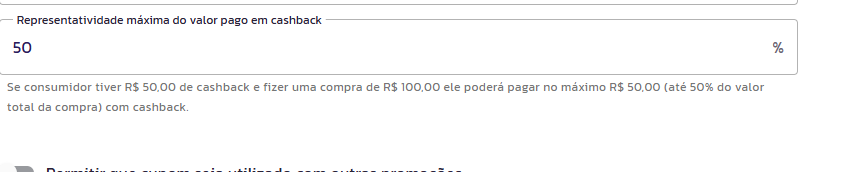 Essa configuração é a porcentagem máxima em cima do valor total da compra que o consumidor poderá utilizar de cashback.