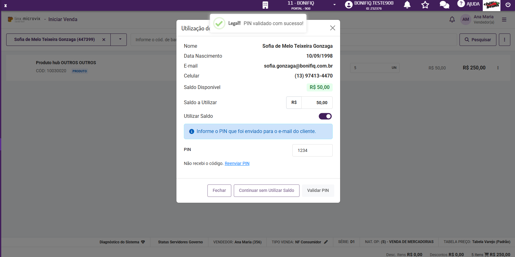 O PIN pode ser enviado por SMS e por e-mail, e também existe um PIN mestre no caso em que o consumidor não receba. Disponível em https://app.bonifiq.com.br/integration/linxfidelity