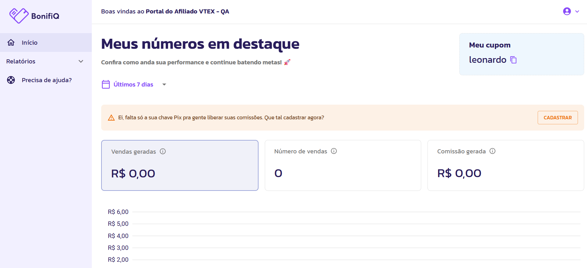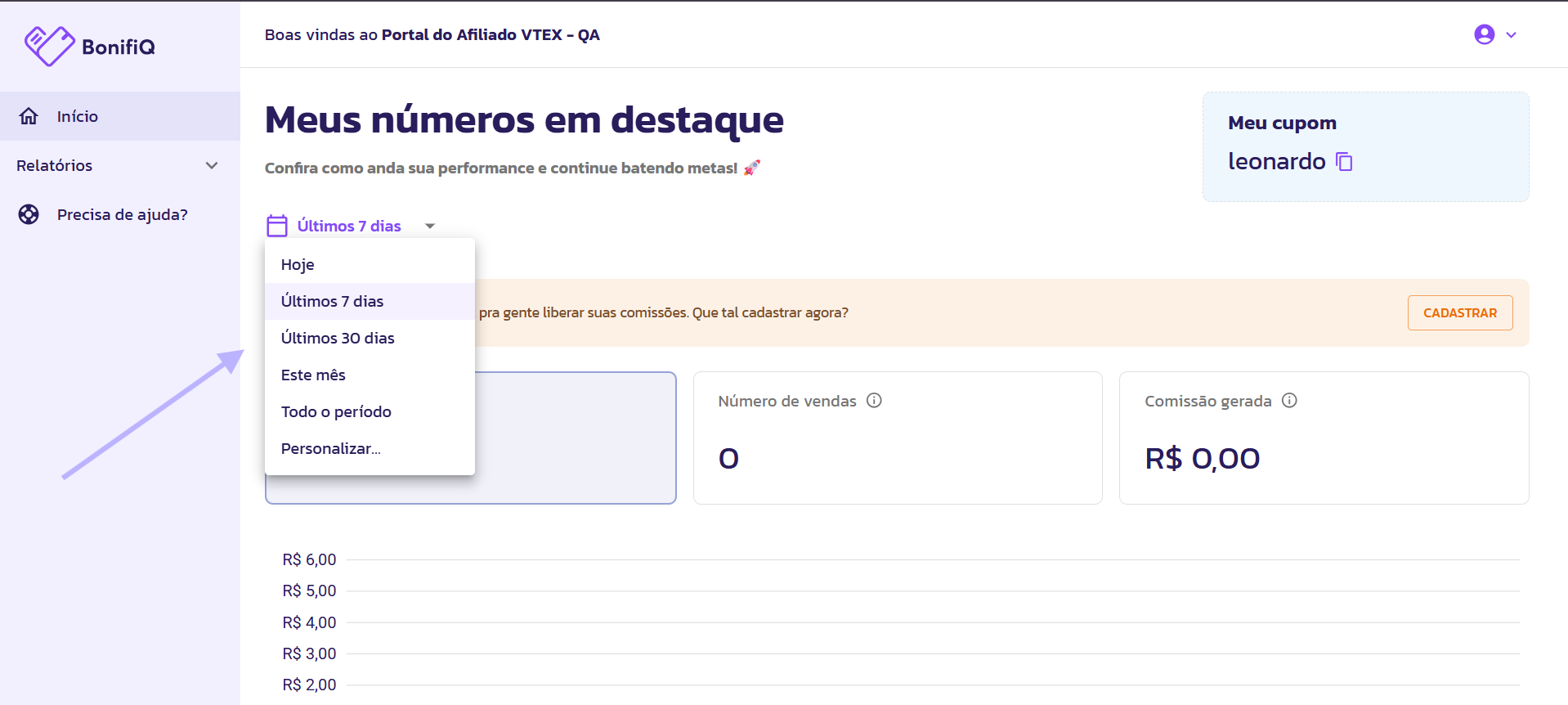 • Meu Cupom: No canto superior direito, você encontra o seu código exclusivo (ex: Leonardo). Este é o código que seus clientes devem usar para que a venda seja atribuída a você. Basta clicar no ícone de "copiar" ao lado do nome para compartilhá-lo rapidamente. • Filtro de Período: Logo acima dos cards, você pode selecionar o intervalo de tempo que deseja analisar (ex: "Últimos 7 dias").