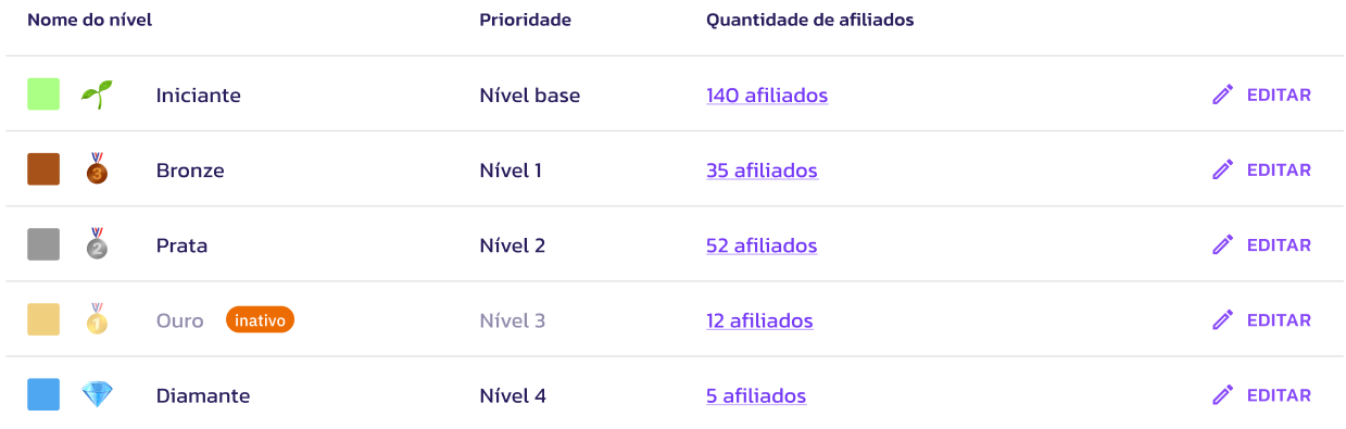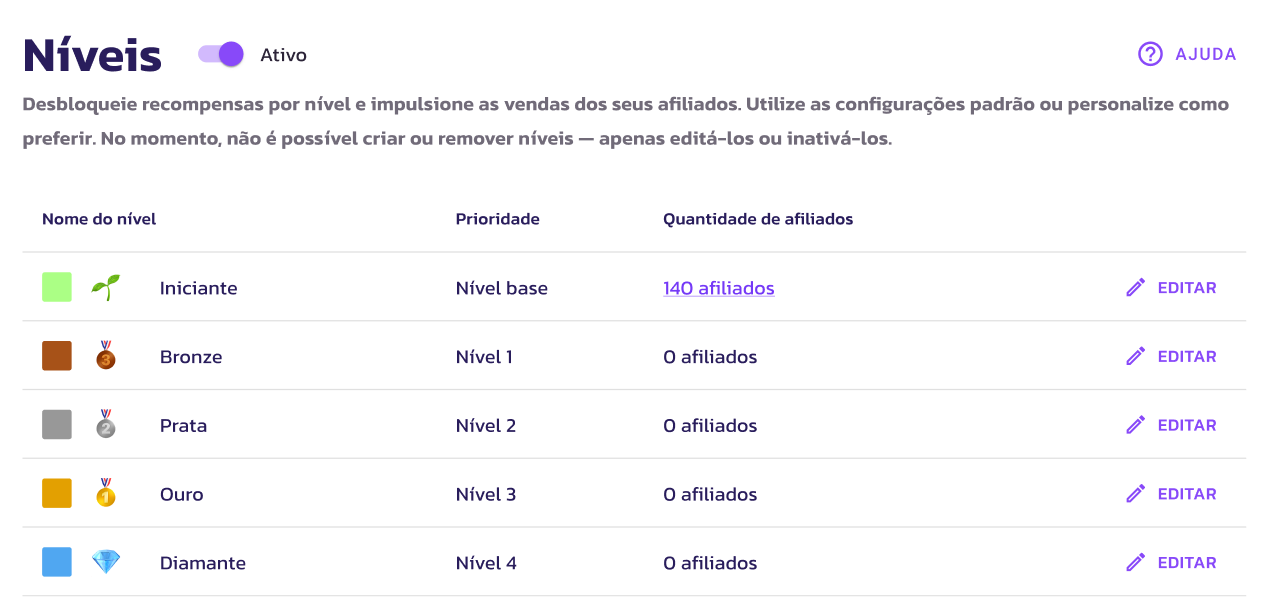 - Importante: Os níveis pré-configurados estão inativos por padrão. É necessário ativá-los para que os afiliados participem da progressão e adquiram os benefícios extras.