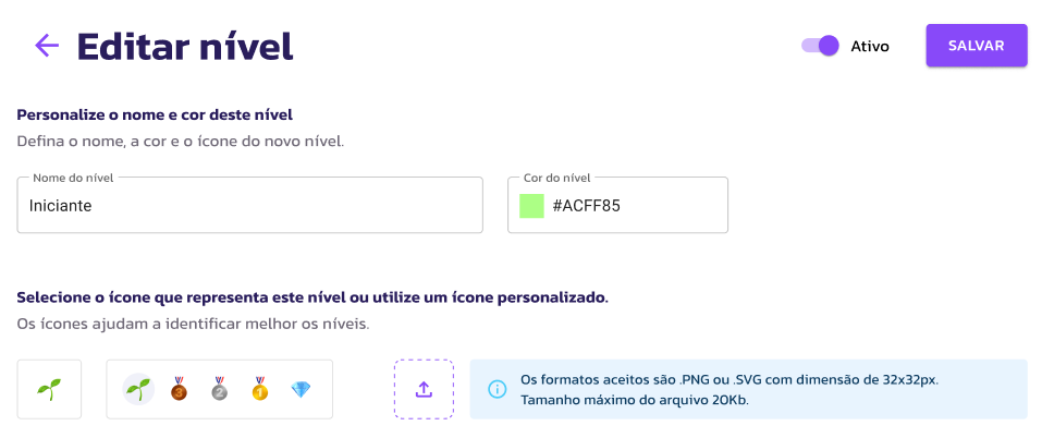 Você pode editar os nomes, ícones e cores desses níveis para que fiquem com a cara da sua marca, mas eles já servem como um excelente ponto de partida. No momento, o sistema permite a personalização completa dos 5 níveis existentes, mas ainda não é possível criar novos níveis ou remover os atuais, apenas inativá-los.