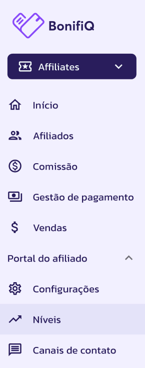 1. Acesse o Menu: No menu lateral da plataforma BonifiQ Affiliates, vá em Portal do afiliado > Níveis.