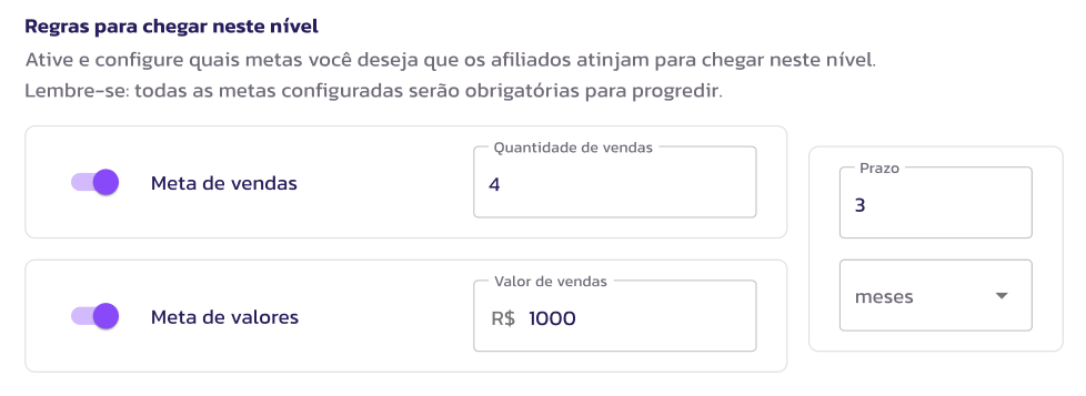 4. Regras para chegar neste nível (Metas): Escolha o que o afiliado precisa atingir para chegar nesse nível — Com base na quantidade de vendas ou no valor das vendas com um determinado prazo a ser atingido.