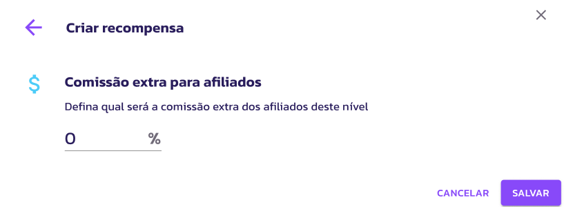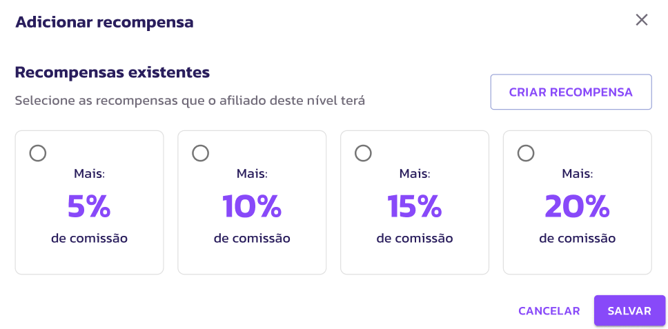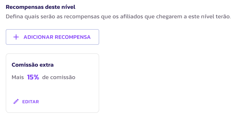 5. Recompensas: Defina a nova porcentagem de comissão, cashback ou bônus em pontos que o afiliado ganhará ao atingir este nível. A BonifiQ Affiliates pré seleciona uma porcentagem de recompensas, mas é possível criar novas recompensas personalizadas.