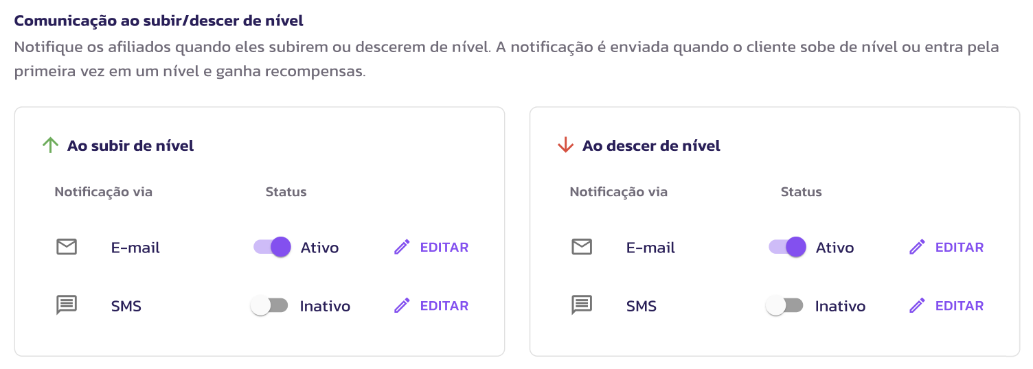 Por padrão, a comunicação via e-mail já vem ativada em sua conta. Isso significa que, assim que o sistema identifica a mudança de nível, um e-mail personalizado é enviado automaticamente ao afiliado, parabenizando-o pela conquista ou informando sobre a nova regra de comissão.