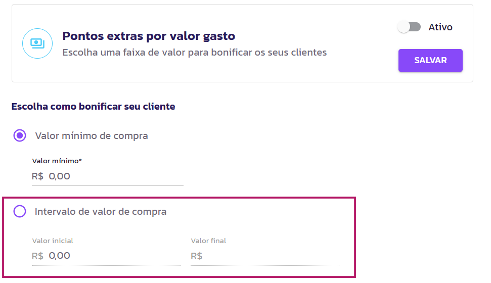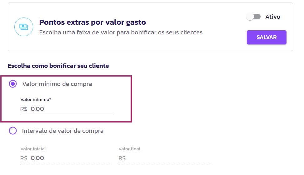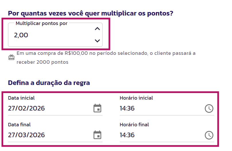 A regra Pontos por Valor Gasto pode ser configurada de duas formas: