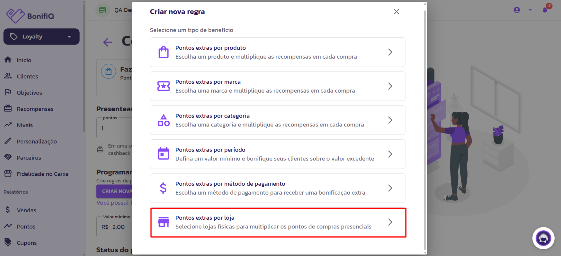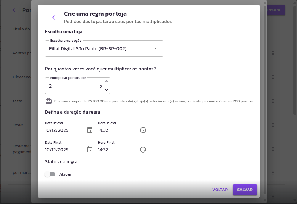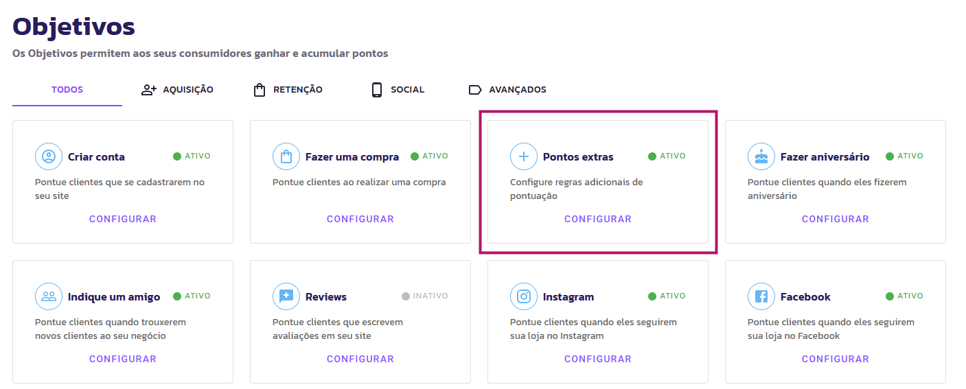 Acessar o menu Programa > Objetivos > Pontos extras - Botão: Nova regra > Pontos extras por loja > Configurar o objetivo e salvar.